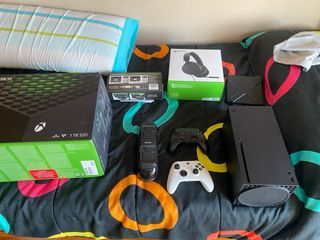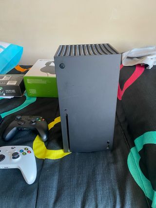 Consola de videojuegos Xbox Series X en color negro. Con dos mandos y base para cargarlos a la vez, auriculares xbox