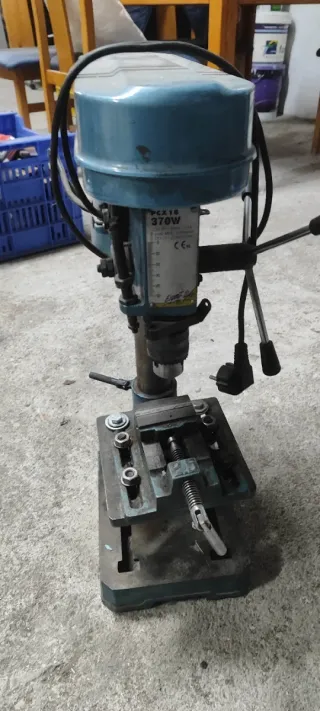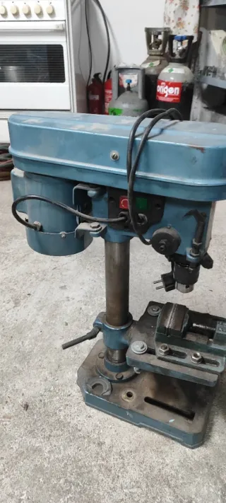 Taladro de banco de color azul, con base y prensa. - Prensa incluida para sujetar piezas. - Base metálica robusta. Funcionamiento correcto