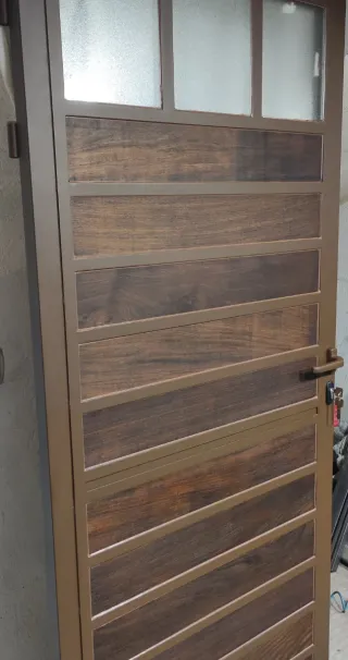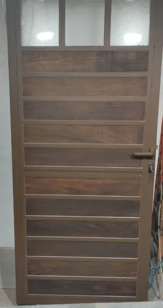 Puerta con estructura de acero y madera tropical. No necesita mantenimiento, la madera es para toda la vida, incluso sumergida en agua no se pudre. Medida 2x1 m (otras medidas pregúnteme). PERSONALIZABLE en el color y accesorios (cristales, tiradores,...). Pintada al horno. Alberto, 623994495. 15 días para entregarla desde el encargo.