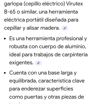 Garlopa (cepillo eléctrico) Virutex B-65 o similar, una herramienta eléctrica portátil diseñada para cepillar y alisar madera. - Es una herramienta profesional y robusta con cuerpo de aluminio, ideal para trabajos de carpintería exigentes. - Cuenta con una base larga y equilibrada, característica clave para enderezar superficies como puertas y otras piezas de madera.