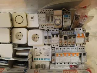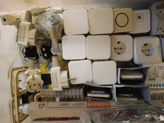 Lote de material eléctrico diverso. - Enchufes y tomas de corriente. - Interruptores. - Componentes de instalación eléctrica.