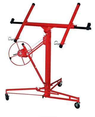 Grúa para levantar placas de yeso, ideal para trabajos en interiores. - Estructura robusta de metal. Soporte elevador XXL para placas de yeso, altura de trabajo ajustable de 132-325 cm, brazo de carga máx. de 295 cm y capacidad de carga de 68 kg, plegable, ayuda de montaje para yeso y - Ruedas para fácil movilidad. - Mecanismo de manivela para elevación.