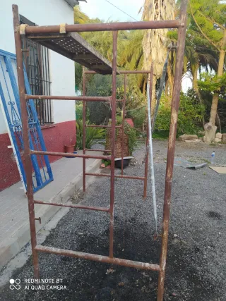 Andamio metálico de color óxido, ideal para trabajos en altura. - Estructura robusta de metal. - Plataformas de trabajo. - Fácil montaje y desmontaje.