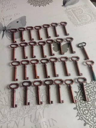 Conjunto de llaves de estilo antiguo, ideales para dar un toque vintage a muebles o proyectos de manualidades. - Material: Metal con acabado en cobre. - Diseño: Clásico con cabeza ovalada. - Cantidad: 30 llaves, dos de ellas con patina verde como se ve en las fotos.