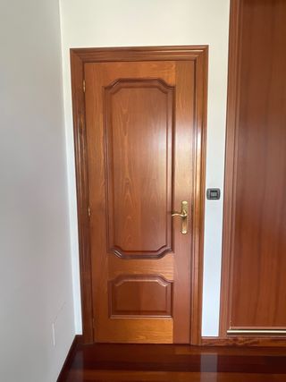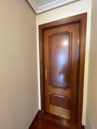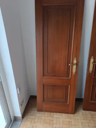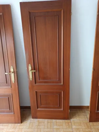 Puerta de madera maciza con un diseño clásico y elegante. - Material: Madera maciza. - Acabado: Barnizado sapelly - 72x200 + molduras - 4 ciegas, 1 sencilla cristal, 1 doble cristal - Herrajes en laton en perfecto estado