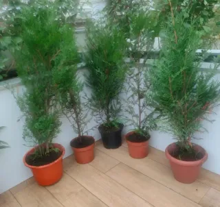 Conjunto de 5 tuyas de aproximadamente 1,5 metros de altura. Ideales para dar un toque verde a tu espacio. En perfecto estado, listas para plantar. - Altura aproximada de 1,5 metros. - Macetas de plástico incluidas. - Se venden como conjunto, preguntar para venta individual.