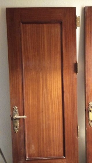 Preciosa pareja de puertas de madera maciza, en buen estado. Ideales para restaurar o usar directamente. - Madera de tono oscuro. - Diseño clásico con dos paneles. - Herrajes de bronce antiguos.
