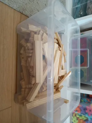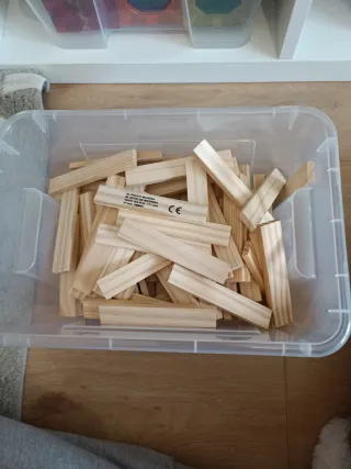 Set de bloques de madera para construir y jugar. Hay unas 110 maderas aprox. Ideal para construir o crear minimundos. No tengo la caja pero los mandaría en una caja de zapatos.