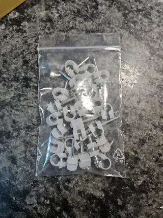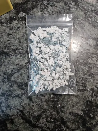Lote de grapas para cableado y clavos. - 160 unidades. - Disponibles en otras medidas. - Grapas de plástico blanco. - Clavos metálicos.