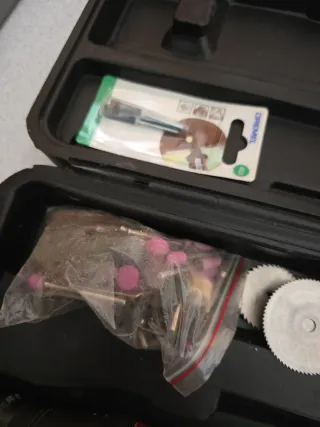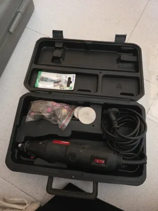 Mini herramienta rotatoria eléctrica, ideal para trabajos de precisión y bricolaje. Viene en su maletín para un fácil almacenamiento y transporte. - Incluye una variedad de accesorios para lijar, cortar y pulir. - Maletín de plástico resistente con compartimentos.