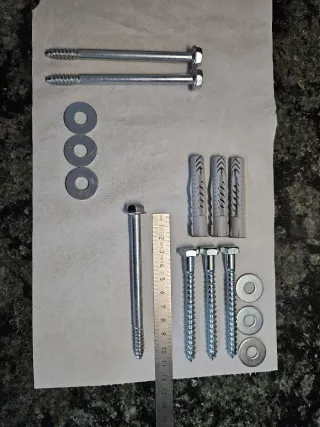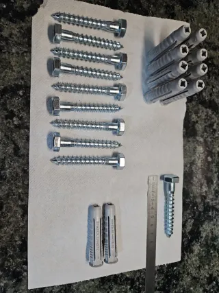 Lote de tornillos para tacos, también conocidos como tornillos barraqueros, junto con arandelas. - 3 tornillos barraqueros grandes. - 3 tornillos barraqueros medianos. - 3 tacos de plástico. - 6 arandelas.