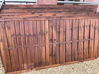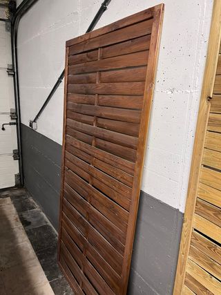Lote de 10 paneles de madera para jardín, con medidas de 90x180 cm. Nueve de ellos están barnizados por un lado. - Material: Madera. - Medidas: 90 cm de ancho x 180 cm de alto. - Cantidad: 10 unidades. - Acabado: 9 paneles barnizados por un lado. Medidas: 90 × 180 cm • 9 paneles barnizados en color oscuro por un lado • 1 panel sin barnizar • Madera para exterior • Usados, en buen estado Ideales para cerramientos, privacidad, terrazas o jardines. Precio nuevo en tienda: ~24 €/unidad. Se venden más baratos por ser de segunda mano. Preferible venta en lote.