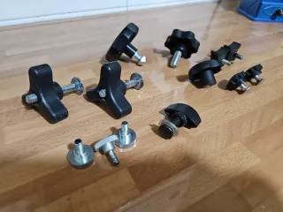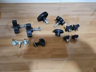 Lote de pomos de apriete de diferentes tamaños y diseños. - Pomos de plástico negro. - Piezas metálicas con rosca.