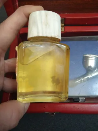 Set de aerógrafo para pintar cuadros. Incluye pistola, bote y accesorios. - Pistola aerógrafo de metal. - Bote de pintura amarillo. - Caja de almacenamiento roja. No se en qué estado estará