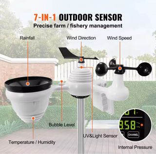 Estación meteorológica Vevor 7 en 1 con conectividad Wi-Fi. Permite monitorear diversas condiciones climáticas. - Pantalla digital a color. - Sensores exteriores incluidos. - Muestra temperatura interior y exterior. - Indica velocidad y dirección del viento. - Registra la cantidad de lluvia. - Mide la presión barométrica. - Incluye pronóstico del tiempo. Nueva en su caja.