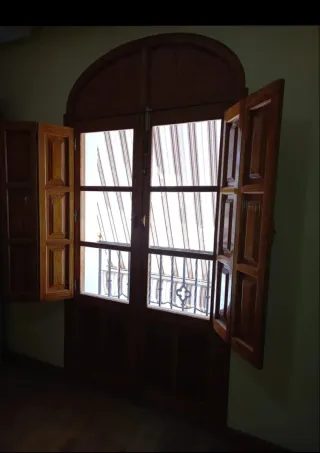 Puerta balconera de madera con acabado en color pino y forma de medio punto. Balconera de medio punto con cristal simple y con postiguillos en el interior por reforma, plafones en toda la parte exterior. una es de 1,23m x 2,37m Te las puedo acercar dependiendo distancia y fijando previamente el precio del porte. El marco tiene un ancho de 14 cm de grosor por lo que es bastante robusta. Por el interior está bien, la parte que da al exterior necesita un poco de lija y barnizado. el arco está muy bien. Si eres un manitas no dudes en comprarla por tan solo este precio, nueva a medida cuesta más de 1.500 €