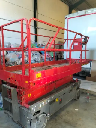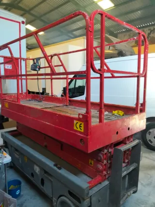 Plataforma elevadora de tijera en color rojo y gris. Ideal para trabajos en altura. - Estructura robusta de tijera. - Plataforma de trabajo amplia. - Ruedas para movilidad. De la marca ahulotte compact 10.cargador incorporado.bandeja extensible.dispone certificado CE