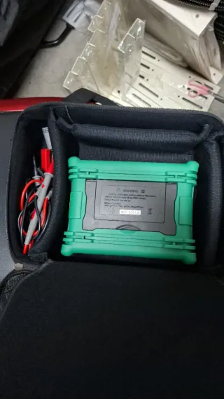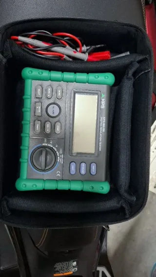 Medidor de aislamiento KPS KPS-MA100, nuevo y sin estrenar. Incluye cables de prueba. - Pantalla digital. - Botones de función: SELECT, READ/A, MEMO, ENTER, TIMER, REL/▼, COMP, LIGHT, HOLD/LOCK, TEST.V. - Selector de modo con opciones como V, Ω, INSULATION. - Carcasa protectora verde.