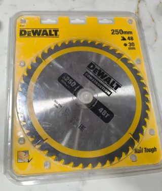 Disco de corte DeWalt Construction para madera, con 48 dientes y 250mm de diámetro. Solo ha tenido un uso. - Diámetro: 250 mm (10) - Número de dientes: 48T - Eje: 30 mm - Máx RPM: 5500 - Modelo: DT1957 - Diseñado para cortes Nail Tough.