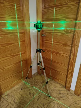Nivel láser profesional con 16 líneas verdes para mediciones precisas. - Incluye trípode y 2 baterías. - Ideal para trabajos de construcción y decoración.