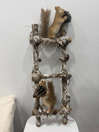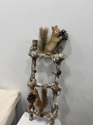 Escalera decorativa con un diseño rústico y encantador, adornada con dos figuras de ardillas y elementos naturales. - Figuras de ardillas con piñas. - Decoración con ramas y piñas de navidad - Estilo rústico y natural. Las ardillas estan sueltas, puedes moverlas a tu gusto, o no ponerlas! Mide unos 70cm de alto y 30 ancho. La escalera es de madera y las ardillas de corcho con la cola de abeto marrón.