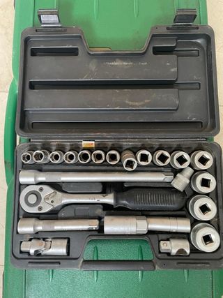 Set de herramientas manuales para diversas tareas. - Incluye carraca. - Variedad de vasos de diferentes tamaños. - Extensión y articulación. - Maletín de plástico resistente para almacenamiento.