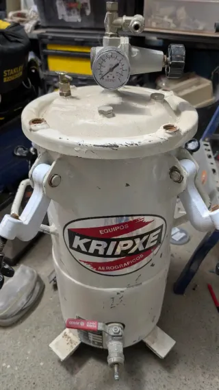 Máquina de pintar de la marca Kripxe, modelo Aerográficos. Ideal para trabajos de pintura. - Incluye manómetro para control de presión. - Válvula de salida inferior. - Construcción robusta.