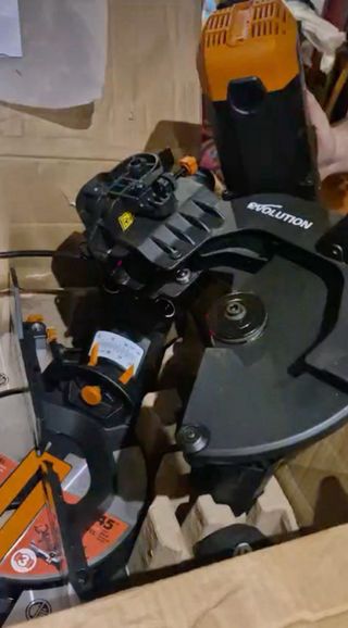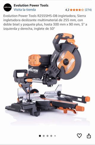 Sierra ingletadora deslizante multimaterial Evolution Power Tools. - Modelo R255SMS-DB. - Doble bisel. - Capacidad de corte hasta 300 mm x 90 mm. - Ángulo de inglete de 50° a izquierda y derecha. - No incluye disco. -Precio en tienda 399,99€ -Se puede ver y probar funciona perfectamente.