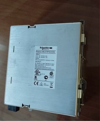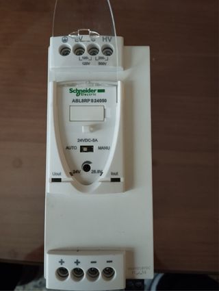 Fuente de alimentación Schneider ABL8RPS24050. - Modelo: ABL8RPS24050. - Voltaje de entrada: 120V / 500V. - Voltaje de salida: 24VDC-5A. - Ajuste de salida: 24V / 28.8V. - Modos: AUTO / MANU.