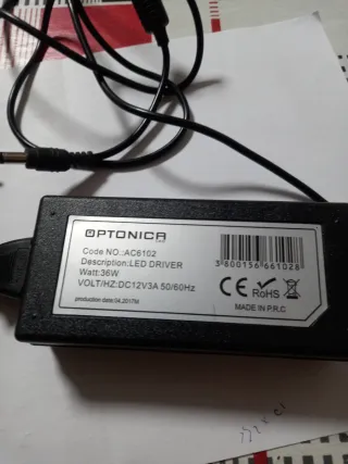 Fuente de alimentación para tiras LED de la marca Optonica. Proporciona una salida de 12V y 3A. - Modelo: ACB102 - Potencia: 36W - Voltaje de entrada: 50/60Hz - Fabricado en PRC