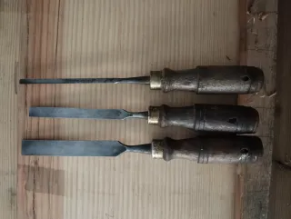 Conjunto de tres formones de carpintería con mangos de madera de la marca Nooitgedagt, acero Sueco. Medidas: -18mm -12mm -6mm