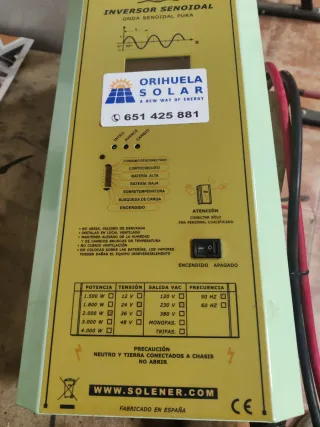 Inversor de onda senoidal pura de la marca Solener.lnstalaciones solares aisladas. Posibilidad de cambio por material solar. - Potencia: 2000 W - Tensión: 24 V - Salida VAC: 230 V - Frecuencia: 60 HZ - Fabricado en España - Modelo: Inversor Senoidal Onda Senoidal Pura
