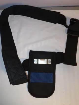Porta metro Dexter de color negro con detalles en azul. - Fabricado en material textil resistente. - Incluye una placa metálica. - Correa ajustable para colgar. 🚛 Envío rápido.