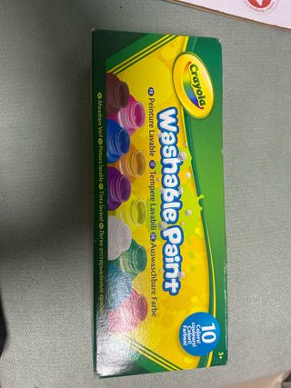 Set de 10 botes de pintura lavable Crayola. - Colores vibrantes y fáciles de limpiar. - Ideal para niños a partir de 3 años. - Son no tóxicas, ideales para proyectos escolares y manualidades. - Se pueden lavar fácilmente de la piel y la mayoría de la ropa de los niños con agua y jabón. - Cada bote contiene aproximadamente 59 ml de pintura. Nuevo sin estrenar. Conserva precinto original. Ideal para regalo