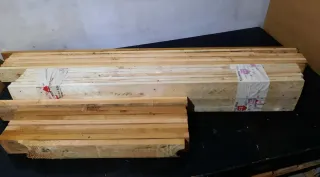Lote de madera de pino, ideal para proyectos de construcción o bricolaje. Las piezas están apiladas y sujetas con flejes de embalaje. - Madera de pino. - Apta para construcción.