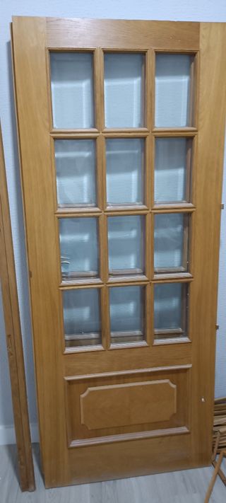 2 puertas de 200x82 con cristales ,de madera maciza de roble ,incluye marco,bisagras,pomo y tapajuntas.