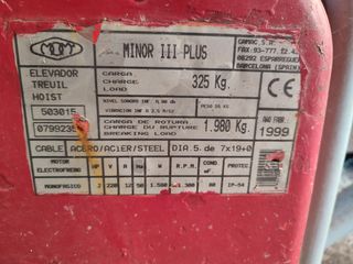 elevador de carga para obras para materiales de máximo de 325 kg con cable de acero con rotura a los 1980 kg, también incluido el trípode para montarlo. En buen estado, precio negociable. ENVÍO NO INCLUIDO EN EL PRECIO, PESO APROXIMADO DEL PRODUCTO 80 KG