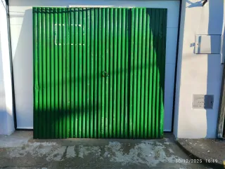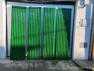 Portón de garaje metálico de color verde, con un diseño acanalado vertical. - Material: Metal - Color: Verde - Medidas: ANCHO 2,25 - ALTO 2,20 - Mecanismo de apertura de 4 hojas - Entrada con puerta y cerradura.
