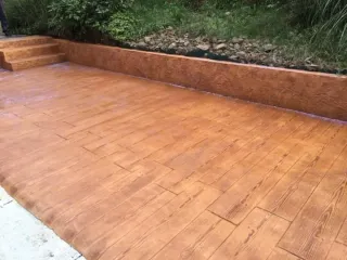 Suelo de hormigón impreso, ideal para patios, terrazas o caminos exteriores. Ofrece un acabado decorativo y duradero. - Diseño imitando piedra o baldosas. - Resistente a la intemperie.