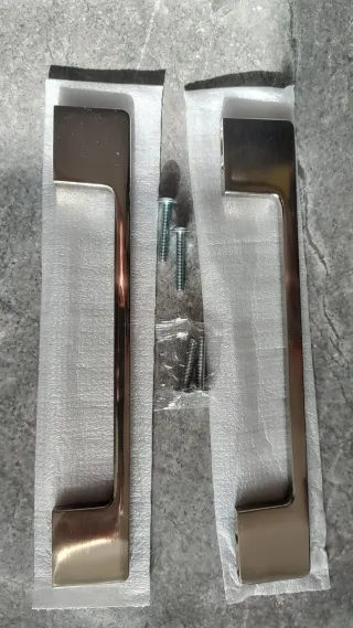 Dos tiradores de metal con acabado plateado, ideales para muebles o puertas. Incluyen tornillos para su instalación. - Diseño moderno y elegante. - Material: Metal. - Color: Plateado. El precio completo por un lote de 21 tiradores.