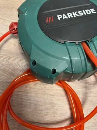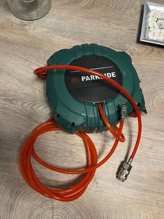Enrollador de manguera de aire comprimido de la marca Parkside. El enrollador es de color verde y la manguera de color naranja. - Manguera de aire comprimido. - Enrollador automático. - Marca: Parkside. 10 meteos