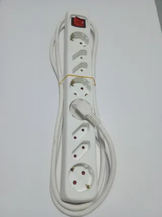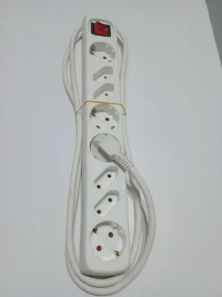 Regleta alargador de color blanco con cinco enchufes y un interruptor general. - Cinco tomas de corriente. - Interruptor de encendido/apagado. - Cable de alimentación incluido.