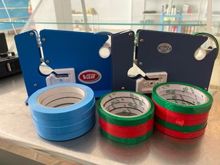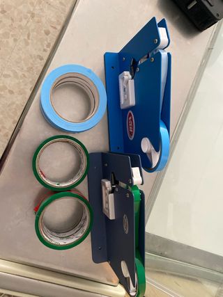 Pack de dos dispensadores de cinta adhesiva, uno azul y otro azul marino. Incluye rollos de cinta. - Dispensador de cinta azul. - Dispensador de cinta azul marino. - Rollos de cinta azul. - Rollos de cinta roja y verde.