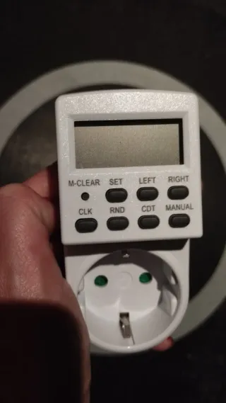 Enchufe con pantalla digital y botones para programar. - Botones: MANUAL, COT, RND, CLK, RIGHT, LEFT, SET, M-CLEAR. - Pantalla LCD.