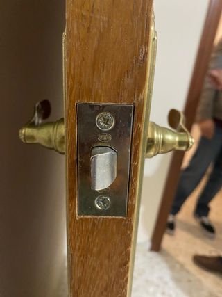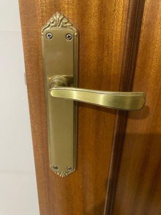 Puerta de madera con detalles en latón y cerradura. - Marco de madera. - Mecanismo de cerradura metálico. - Manillas doradas.