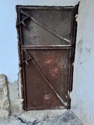 Puerta de hierro con un diseño robusto y detalles industriales. - Material: Hierro. - 105cm de ancho - 205 cm de alto
