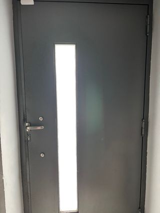 Puerta de entrada de hierro macizo con 3 puntos de seguridad - Acabado en color gris texturizado. - Detalle de cristal translúcido. - Tirador metálico alargado.