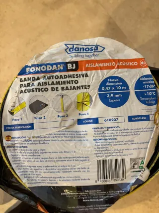 Banda autoadhesiva Fonodan BJ para aislamiento acústico de bajantes. HEMOS USADO 3M QUEDAN 7M. COSTÓ 75 EUROS - Nueva dimensión: 0,47 x 7 m. - Grosor: 3,9 mm. - Aislamiento acústico: -17dB*. - Temperatura de trabajo: >10°C. - Código: 610207. - Euroclase.