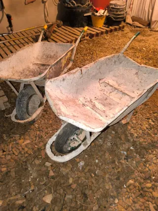 Carretilla de obra resistente, ideal para trabajos de construcción o jardinería. Se venden juntas o por separado. Precio por unidad. Ruedas en mal estado. Es necesario cambiarlas. Se dispone de dos. Habria que ir a recogerlas a Torrenueva (Ciudad Real) - Cubeta de gran capacidad. - Rueda neumática para facilitar el transporte. - Mangos ergonómicos para un mejor agarre.