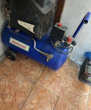 CONTACTAR SOLO POR LLAMADA: 622551600 Compresor de aire de color azul con ruedas y asa para facilitar su transporte. Incluye manómetro y regulador de presión. - Depósito de aire. - Motor eléctrico. - Asa de transporte. - Ruedas.